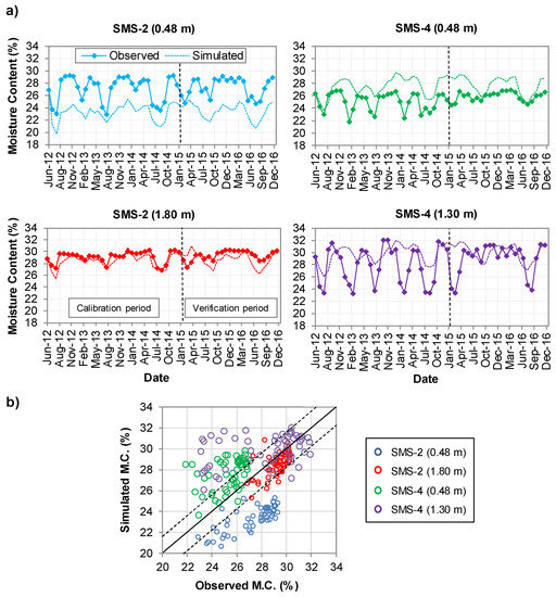 Figure 5a plots the observed and simulated moisture contents at both depths at SMS-2 (0.48 m and 1.80 m) and SMS-4 (0.48 m and 1.30 m). It is evident from the calibration period that the simulated moisture contents are reasonably correlated with the observed moisture contents. For instance, the general variation and trend in moisture content at all four observation points were obtained by the model simulation.