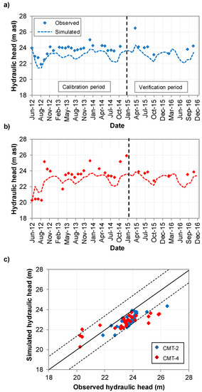 The key parameters used during the calibration and verification of the transient variably saturated flow model were moisture content and hydraulic heads, which were recorded at the SMSs and CMT wells, respectively. As shown in Figure 2a, SMS-2, SMS-4, CMT-2 and CMT-4 are located along the model domain.
