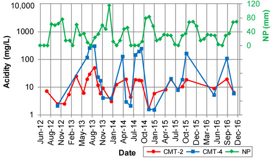 Acidity concentrations measured at CMT-2 and CMT-4 between June 2012 and December 2016 are shown in Figure 7. As shown in Figure 2b, CMT-4 is downgradient along the prominent groundwater flow direction and contaminant pathway, thereby exhibiting higher acidity concentrations compared to CMT-2.