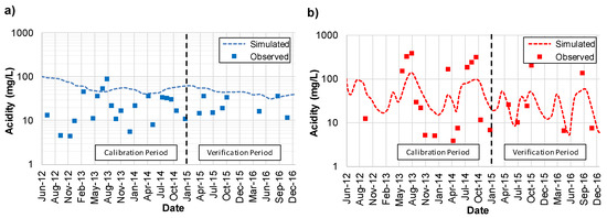 It is evident from Figure 8a,b that a reasonable correlation exists between the simulated and observed acidity concentrations over time at both CMT-2 and CMT-4. The general trends in observed acidity concentrations were repeated in the simulated concentrations. The magnitude of simulated acidity concentrations were somewhat overestimated at CMT-2; the homogeneous ‘starting’ acidity included the high downgradient acidity, while CMT-2 was located at the upgradient end of the pile. The calibrated model was then verified with the subsequent two years of observed data (January 2015 to December 2016).