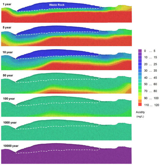Spatial distribution of simulated acidity concentrations over time at the Lingan WRP. The white dashed line defines the base of the waste rock layer throughout all time steps.