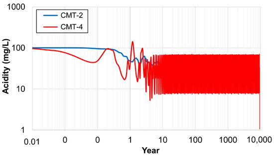 To better analyze the evolution of the AMD plume, Figure 10 presents the acidity concentrations in groundwater at CMT-2 and CMT-4. Acidity concentrations at both wells improve from their initial pre-cover concentrations to the post-cover seepage concentrations. At 9229 years, the acidity at CMT-2 and CMT-4 decreases to the target concentration of 1.75 mg/L.