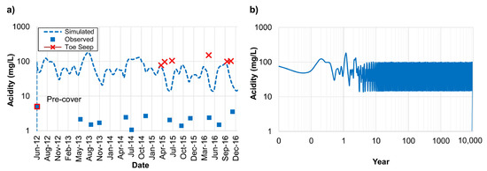 (a) Evolution of observed and simulated acidity concentrations in Graces Brook, and acidity observed at the toe seep (red x’s), and (b) predicted acidity concentrations during the simulation period. The blue square with the red outline in (a) represents the mean observed pre-cover acidity.