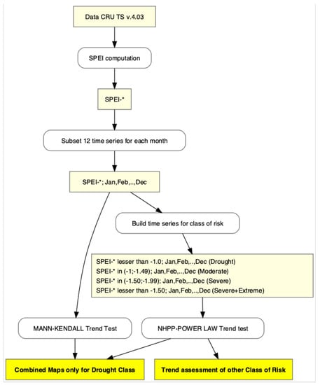 Technical flow chart for the proposed method (the asterisk symbol refers to the different scale of aggregation used for the SPEI computation).