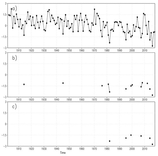 Time series of SPEI-6 March values from 1901 to 2018 at location 37.00° N, 2.25° W of Iberian peninsula: (a) value for March of each year; and (b,c) only the values belonging to Drought and Severe+Extreme classes, respectively. The connecting lines in (b,c) identify two consecutive episodes occurred in the same class.