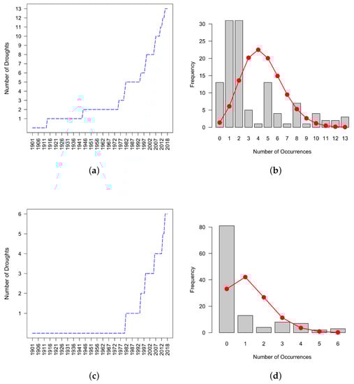 Let us again use the example in Figure 2 to illustrate the NHPP theoretical framework. In Figure 2b,c we take the instant times at which the drought episodes occur and use them to draw the cumulated function of drought episodes. The result of this action is plotted in Figure 3a,c, where the x-axis represents the sequence of years from 1901 to 2018 for the month of March and the y-axis is the number of drought episodes occurred in the class Drought and Severe+Extreme, respectively. By visualizing the histograms in the correspondent Figure 3b,d, it appears evident the concept of counting process: for each time ordered drought episode in the x-axis, the y-axis reports the number of years to wait for the successive episode. The red line represents the fitting of the data to the Poisson distribution. In the case of this example, the test gives a good fit as a result; nevertheless, it appears from the graphs that there exists a strong dependence of the process intensity on time. That is why we use NHPP.