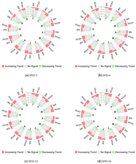 As mentioned in Section 2.3, to compare the two methods, we focused the analysis on the defined Drought class, since it includes all the possible dry events identified by SPEI (see Table 2). The result of this comparison is summarized by the number of grid cells out of the total 259,200 where the two tests give a significant trend. Figure 4 reports the relative number of grid cells where the test gives positive trend (red), i.e., the increasing on time of the drought events, negative trend (green), and non-significant trend (light grey), for each month of the year and for each index time scale.