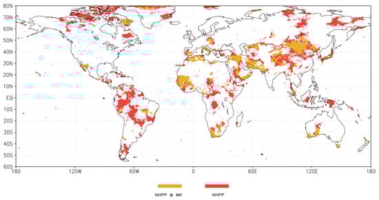 In fact, the map in Figure 6 reports only the cases of a positive trend for SPEI-6 March resulting from both the tests presented in this study. From this map, it clearly appears how the areas under risk of increasing drought events are significantly larger if the NHPP approach is used instead of M-K to test the trend. Notice that, in this map, the response of positive trend given by NHPP is represented by the union of yellow and red areas.