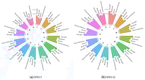 Circular plots of the frequency of SPEI drought events when the NHPP test results in a positive significant trend of droughts for each class and month given that M-K test also results in a positive significant trend in the period 1901-2018: (a) SPEI-3; and (b) SPEI-12. (The y-axis is drawn as square root of frequency to highlight the differences between classes.)