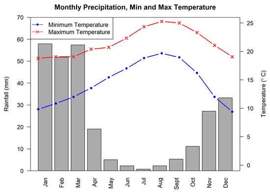 San Diego County generally has a mild Mediterranean climate, while experiencing microclimate shifts from west to east. From the coast to the mountains, the semi-arid Middle Latitude Steppe climate transitions to a hot–mild Mediterranean climate, with both regions experiencing warm–hot, dry, and sunny summers and cooler, wetter winters. Precipitation and temperature extremes increase from the beaches and lower elevations in the west to the mountains in the central-east part of the county, which receive frost and snow during winter. The mountains receive more rainfall than average in Southern California, while the county’s desert region in the east lies in a rain shadow that extends into the Desert Southwest region of North America. Average annual rainfall amounts typically vary, with the county’s coastal areas receiving 250 mm, the mountain peaks receiving over 800 mm, and the low desert areas often receiving less than 150 mm of rain [32]. Approximately 85% of all rainfall in the county happens between November and March [33] (Figure 2). Temperatures and temperature ranges can also vary considerably between microclimates and often short distances (15–30 °C difference) in the county [33].