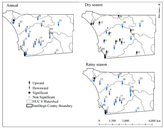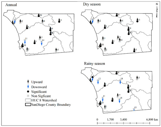 Annual and seasonal spatial rainfall distribution over the county held a similar pattern among all three temporal scales used for the analysis. Long-term mean rainfall within San Diego County ranged from 720 mm in the mountainous areas (east of the Santa Margarita watershed and northeast of the San Diego watershed) to 130 mm in the desert (San Felipe Creek watershed) during the study period (1985–2017) (Table 2). From the 20 rainfall measurement stations analyzed, only one in the southwest of the county showed a statistically significant upward trend (0.5 mm increase over the study period) (Table 2; Figure 3). The remaining 19 stations showed slightly decreased rainfall with a magnitude of 0.18 mm on average) between 1985 and 2017 (Table 2; Figure 3). Data at the remaining stations suggest overall decreasing rainfall in the county with a statistically significant decreasing trend at one only station (Figure 3; Figure 4; Appendix A).