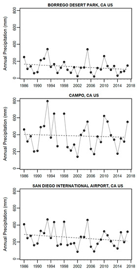 Annual rainfall time series (1985–2017) and corresponding interpolated regression lines for three rain gauges located respectively from top to bottom in the northeastern, central, and southwestern (City of San Diego) regions of San Diego County.