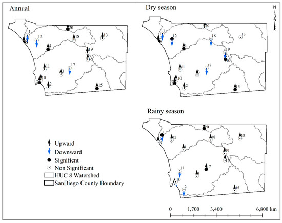 The seasonal analysis revealed similar spatial patterns for the trend in rainy months compared to annual trend characteristics (Figure 3). Since most rain events occur during the rainy season, it is expected that annual trends were mostly driven by the rainfall events of this period. With only one station showing statistically significant downward trends (Table 2; Figure 3), rainfall during the rainy season averaged 0.19 mm (from 100 mm to 620 mm) over the study period, with downward trends for the majority of stations examined corresponding to a magnitude of 0.01 mm to 0.43 mm for stations (Table 2; Figure 3 and Figure 4). Unlike trend characteristics during the rainy season, rainfall during the dry season showed slight upward trends with an average of 0.09 mm (>0.00 to 0.50 mm) in 12 out of 20 stations during the study period (Table 2; Figure 3), suggesting a possible shift in rainfall patterns in the region. The station with statistically significant increasing trends was located in the Imperial Beach area (Figure 3), which receives frequent and abundant rainfall events compared to the rest of the county. This may be attributable to a combination of the area’s coastal micro-climate and the effects of local topographic features on weather patterns: sea surface evaporation could create excess moisture along the coast while orographic blocking by the rapid increase in slope of the nearby Tijuana Hills and San Ysidro and Jamul Mountains could lead to increased precipitation during rainfall events [44].