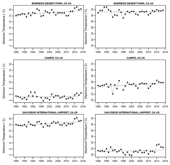 Mean annual temperature time series (1985–2017) and corresponding interpolated regression lines for three rain gauges located respectively, from top to bottom, in the northeastern, central, and southwestern (City of San Diego) regions of San Diego County.