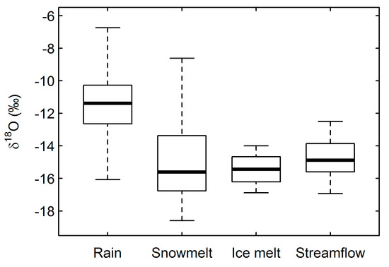 - Schmieder, J.; Garvelmann, J.; Marke, T.; Strasser, U. Spatio-temporal tracer variability in the glacier melt end-member — how does it affect hydrograph separation results? Hydrol. Process. 2018, 32, 1828–1843. [Google Scholar] [CrossRef]