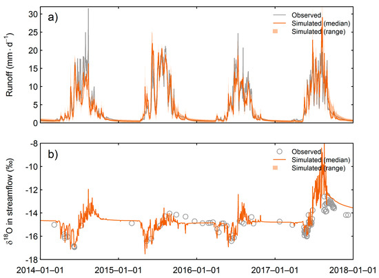 - Structural uncertainty: We used a top-down modeling approach including a pre-defined model structure and tested it in our complex study catchment. The transfer functions were chosen by prior modeling experiments and the TPLR for runoff and the flexible GM for streamflow δ18O were used. The latter allows for both, fast tracer throughputs and relatively long transit times [76], and did not assume a well-mixed reservoir, which was suitable for application in our catchment. Both transfer functions were proved best regarding the objective functions.