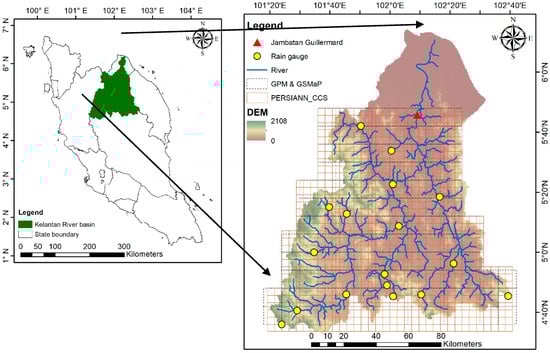Distribution of rain gauges and Jambatan Guillermard river flow measuring station in Kelantan River basin and the resolution (Global Satellite Mapping of Precipitation (GSMaP) and Global Precipitation Measurement (GPM) with 0.1°; Precipitation Estimation from Remotely Sensed Information using Artificial Neural Networks-Cloud Classification System (PERSIANN-CCS) with 0.04°) and coverage of different satellite rainfall products.