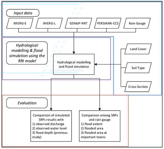 Figure 2 show the flowchart of the present study. The overall methodology is divided into three phases, i.e., input data (blue blox), two-dimensional hydrodynamic modelling using SRPs (purple box) and evaluation of the results (red box). All SRP data and rain gauge data were separately used runoff modeling and flood inundation mapping.