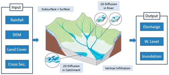 The typical flood modelling consists two parts: (i) rainfall-runoff modelling, and (ii) hydraulic simulation [,,]. The authors of [] coupled two models from Hydrologic Engineering Center (HEC) of which HEC-HMS output is used as input to HEC-RAS for flood mapping using Geographical Information System (GIS) and remote sensing data. Such coupling controlled by upstream boundary conditions, i.e., discharge or water level [] and less useful in emergency situations. It led to the development of a commercial integrated one-dimensional and two-dimensional (1D2D) model, e.g., SOBEK, MIKE Flood, and Flood Modeller. However, these models are impracticable for areas greater than 1000 km2 when the required resolution is less than 10 m, as the calculation time may be considerably long []. The authors of [] developed a rainfall-runoff–inundation (RRI) model, integrating the rainfall-runoff simulation and the hydrodynamic model. The advantage of the RRI model can simulate flooding and estimate river flow at downstream floodplains and upstream mountain areas simultaneously, modelling flood inundation at multiple basins [].