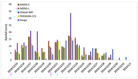 The present study focuses on the emergency phase of the disaster management cycle. Therefore, a simple comparison between SRPs and rain gauge on extreme rainfall event was carried out (Figure 4). According to [], the December 2014 flood event had two phases. The first phase was during 15–19 December, while the second phase was from 20 to 24 December. Generally, all the satellite rainfall products were found capable in capturing these two phases. However, GSMaP-NRT was able to record two extreme peak rainfalls on 17 and 23 December 2014. The daily amount of rainfalls on those two days were twofold relative to other SRPs and the rain gauge estimation.