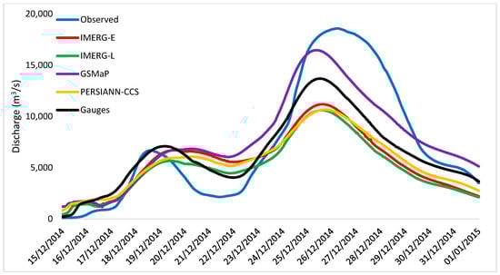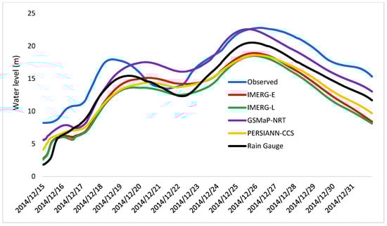 Based on the hydrographs, all simulated runoff produced by each SRP has a similar pattern. It was also noticed that all SRPs captured the peak discharge and water level one day in advance, which are consistent with the observed data. However, only the peak discharge and water level produced by GSMaP-NRT was relatively close to the observed data. The peak discharge and water level produced by the GSMaP-NRT were 16,461 m3/s and 22.1 m, respectively, compared to 18,576 m3/s and 22.8 m, respectively, estimated using observed data. This means that GSMaP-NRT was successful in capturing the areal peak rainfall from 21 to 24 December, which other SRPs and rain gauge stations could not do (see Figure 4).