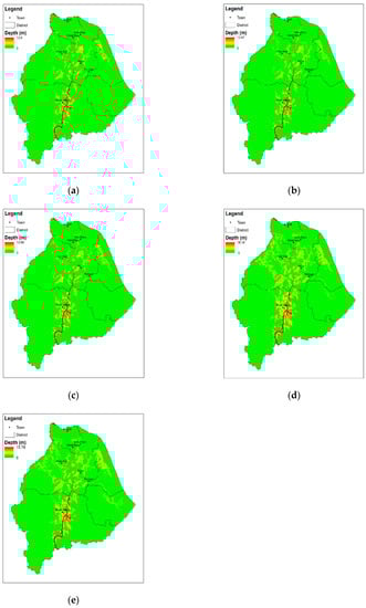 Distribution of maximum flood inundation depth at downstream from 15 December 2014 to 1 January 2015, calculated by the calibrated Rainfall-Runoff-Inundation (RRI) model; (a) Precipitation Estimation from Remotely Sensed Information using Artificial Neural Networks- Cloud Classification System (PERSIANN-CCS) (b) Integrated Multi-satellitE Retrievals-Late (IMERG-L) (c) Integrated Multi-satellitE Retrievals-Early (IMERG-E) (d) Global Satellite Mapping of Precipitation GSMaP (e) Gauge.