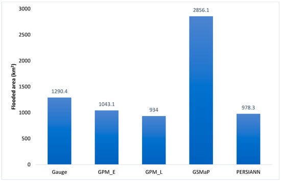 Comparison of flooded area at downstream derived using hydrological model using different satellite precipitation products and rain gauge data.