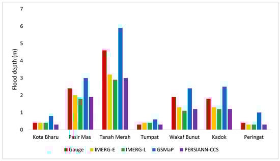 The spatial extent of maximum flood inundation in the downstream area from 15 December 2014 to 1 January 2015 is illustrated using the calibrated RRI model with SRPs and the gauged data in Figure 7. The figure shows that although the study area is relatively flat, the flooding differences were noticeable. Figure 8 shows the comparison of flooded area derived from SRPs and rain gauge. GSMaP-NRT data produced the most extensive coverage of the flooded area with 2856.1 km2. However, the flooded area created by the GSMaP-NRT was 2 to 3 times larger compared to that produced by other SRPs and rain gauge data. The generated flood map also showed that Tanah Merah had the worst flood situation. According to [], Tanah Merah is one of the worst affected areas, together with Kuala Krai and Gua Musang. A comparison of flood depth in different towns in the downstream area also conducted, and the results are shown in Figure 9 and Table 3. Tanah Merah showed the highest flood depth of 5.9 m followed by Pasir Mas (3 m), Kadok (2.5 m), Wakaf Bunut (2.4 m), Peringat (1 m), and Kota Bharu (0.8 m). This study only carried out a simple flood depth assessment without validation with the ground truth data. However, flood depth record was available at Pangkalan Krai Jetty from the previous study by Yahaya et al. (2015) which was used to verify the simulated flood depth obtained from SRPs and rain gauge. The results showed that the GSMaP produced the closest flood depth with 1.4 m difference, and the difference in flood depths estimated other products was between 3.8 m and 6.4 m (Table 4).