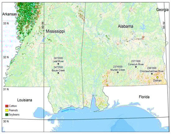 Map of coastal MS-AL showing the location of coastal streamflow gages along with areas where cotton, peanuts, and soybeans are grown. The crop data was acquired from the USDA Cropland Data Layer (2015).