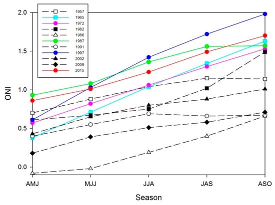 The Oceanic Niño Index (ONI) is one of the primary indices used to monitor the El Niño-Southern Oscillation (ENSO). The ONI uses the same Pacific Ocean region as the Niño-3.4 region (5°S–5°N; 170°W–120°W) and is calculated by averaging sea surface temperature anomalies for a 3-month time average (running mean) to better isolate variability closely related to the ENSO phenomenon []. Ten El Niño events (1957, 1965, 1972, 1982, 1986, 1987, 1991, 1997, 2002, and 2009) were identified and the seasonal ONI (April–June (AMJ), May–July (MJJ), June–August (JJA), July–September (JAS), August–October (ASO) for each of these events were correlated with seasonal ONI for the 2015 El Niño. Historic El Niño’s which correlated (significance greater than 99%) with the 2015 El Niño were retained []. A two-sample t-test of the means (significance greater than 99%) was then performed with the retained historic El Niño’s and 2015 El Niño events []. This resulted in four El Niño events (1965, 1972, 1987, and 1997) being statistically similar to the 2015 El Niño (Figure 2).