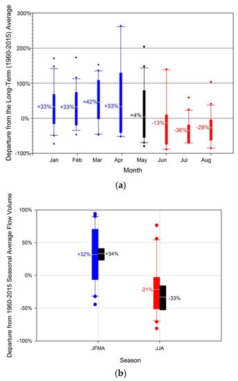 From these results, two seasonal forecasts (winter-spring (JFMA) and summer (JJA)) were developed, similar to the ensemble streamflow prediction (ESP) []. Given that the evaluation of the ONI ended in October of 2015, the lead-times of these predictions were two months and seven months, respectively. To accomplish this, the departure (percentage difference) between each post-El Niño year and the historic long-term average was calculated for each season (JFMA and JJA), for each gage. Thus, for each season, 20 departure values (four post-El Niño years and five gages) were calculated. The seasonal trends were then compared to 2016 observations.