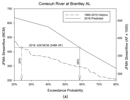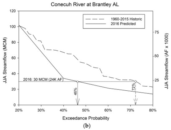 Observed (long-term average) and predicted (using historic El Niño events) exceedance probability curves for (a) winter-spring (JFMA) and (b) summer (JJA) seasonal streamflows for the Conecuh River. The observed 2016 streamflow for each season and corresponding exceedance probability is provided.