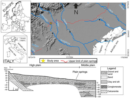 The Venetian Plain is delimited on the north by the Pre Alps, on the east by the Livenza river, on the west by Lessini mountains, Berici and Euganei hills, on the south by the Adige river and the Adriatic Sea. The alpine limit of the plain is on 150–200 m a.s.l., diminishing towards SSE until the coast. From the West to the East, we can observe the hydrographical system of Leogra Timonchio, Astico Bacchiglione, Brenta and Piave; these rivers have deposited a huge amount of loose materials, forming the subsoil of the Venetian Plain. Therefore, the Venetian Plain consists of several large alluvial fans (Plio Quaternary deposits) called “megafans” whose width increases towards the SSE [47]. The hydrogeological features of the Venetian Plain depend principally on the depositional sequences of the rivers and on their granulometric characteristics. In the upper part of the alluvial plain, near the Pre Alps, where the subsoil is composed almost totally by gravels, there is only a thick unconfined aquifer with high hydraulic conductivity (10−1–10−2 m/s).