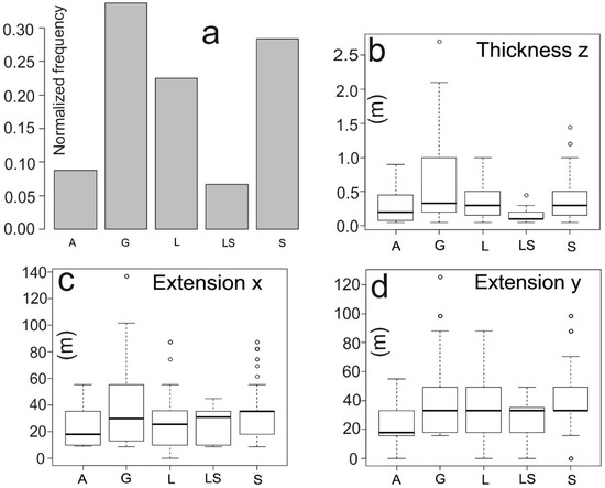 As visible in Figure 3b, layers made out of gravels (G) present more variation in thickness than the other four lithologies, while the variation in the lithological extension along the directions X and Y (Figure 3c,d) is higher but comparable between them.