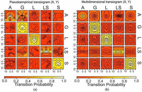 Surface theoretical transiograms without (a) and with (b) ellipsoidal interpolation.