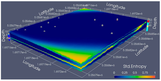 In this work, standardized conditional entropy index represents the uncertainty of the spatial information linked to the simulated lithologies. In other words, the 3D entropy index suggests both zones where the information is accurate and where lithological information should be improved. As is visible in Figure 7, the maximum entropy (i.e., entropy ≥ 0.9) is located in zones with a lack of boreholes. Low values of entropy, instead, cover the zones where more boreholes are located. The conditional entropy map depicts good reliability in the zones where the boreholes are present. More uncertain areas are located where the boreholes are missing or sparse. In this sense, the normalized entropy volume gives us an important hint for a possible enhancement of coring, showing where new information should be acquired (i.e., zones with entropy ≥ 0.9).