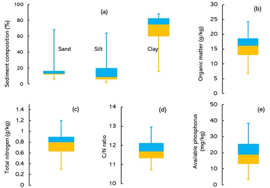 The average organic matter content of the sediment was 16 g kg−1 with a range of 7 to 24g kg−1, total nitrogen was from 0.3 to 1.2 g kg−1 with an average value of 0.8 g kg−1, and the sediment available phosphorus was 19 mg kg−1 and ranged between 3.5 to 39 mg kg−1 (Table A1). The organic matter was with lower outliers, total nitrogen was normally distributed, and available phosphorus and the C/N ratio were positively skewed (Table S1 in the Supplemental Material). However, the medians are fairly close to the center of the box, and the whiskers are of approximately equal length for the contents of organic matter, total nitrogen, C/N, and available phosphorus (Figure 3).