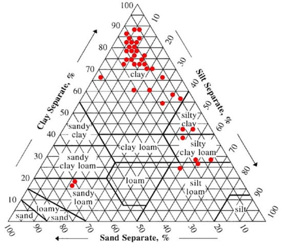 The bottom sediment had an average of 16% sand, 17% silt, and 67% clay. The median is 13% sand, 9% silt, and 75% for clay (Table A1 in the Appendix). The clay content was positively skewed with lower outliers, and sand and silt fractions were negatively skewed with upper outliers (Figure 3, Table S1 in the Supplemental Material). Based on USDA soil classification, the bottom sediment composition, texture class, was mainly clay with limited occurrence of sandy loams at sampling points 13, 27, and 31, silty loams at sampling points 1 (Tana Beles tunnel inlet) and 25, silty clay loam at sampling points 58, 24, and 28, and silty clay at sampling points 56 and 57 (Figure 4; locations of the sampling points are given in Figure 1).
