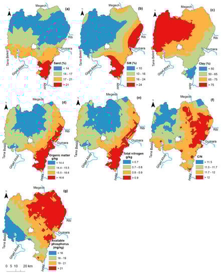 Bottom sediment characteristics of Lake Tana: Sediment composition; (a) sand, (b) silt, (c) clay percentages, (d) organic matter concentration of sediment, (e) total nitrogen concentration of sediment, (f) carbon to nitrogen ratio, and (g) available phosphorus concentration of the sediment.