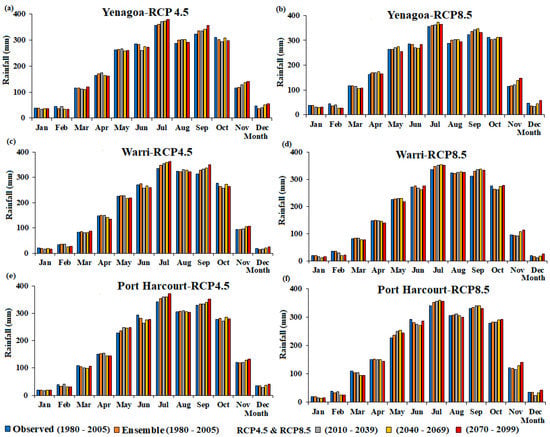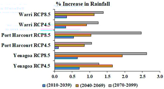 The distribution of mean monthly observed and predicted rainfall scenarios in the study locations are shown in Figure 2a–f, respectively. The projected models were grouped into three time periods of 2010–2039, 2040–2069, and 2070–2099. The monthly distribution, as presented in Figure 2, shows that the projected rainfall, in comparison with the observed rainfall, predicts an increasing trend across all stations and all predicted durations. The highest increase across all three stations was projected to be during the 2070–2099 period. In Port-Harcourt, the rainfall is projected to increase by 1.06% under RCP4.5, and 2.47% under RCP8.5. Yenagoa is also projected to experience an increase of about 1.27% under RCP4.5 and 2.62% under RCP8.5. In comparison, Warri Station is also predicted to experience an increase of about 1.24% under RCP4.5, and 1.39% under RCP8.5 toward the end of the century, as shown in Figure 3. This projected increase in rainfall confirms the report of the IPCC [25] in response to greenhouse gases forcing, which is consistent with other parts of the world [46,47,48,49].