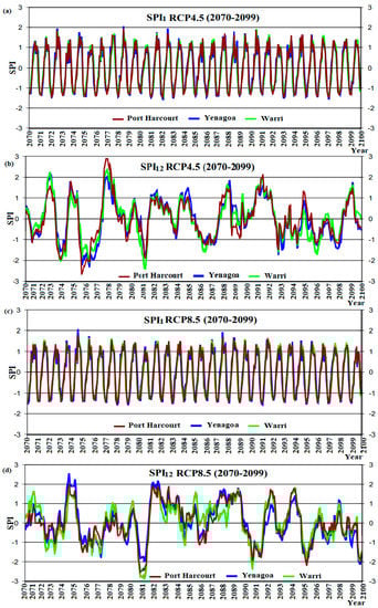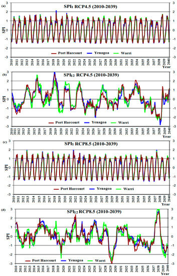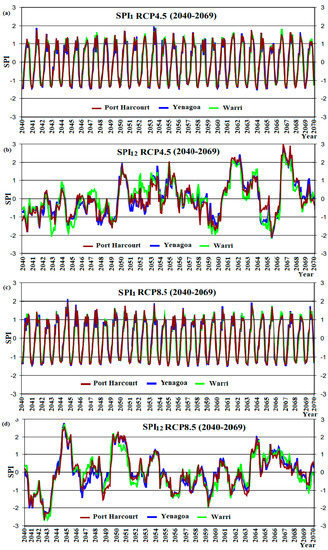 Analysis of SPI variability for the period 2010 to 2039 across the study area shows that the 1-month SPI predicted an exceedance in extreme wet event threshold (i.e., SPI > 2) at Yenagoa Station once under RCP4.5 (Figure 5a) and twice under RCP8.5 (Figure 5c) during the thirty year mean. The 12-month SPI under RCP4.5 and RCP8.5 in Figure 5b,d also predict an exceedance in extreme wet event threshold (i.e., SPI > 2) twice during the thirty year mean, similar to the baseline period. No station predicted the risk of severe dryness (i.e., −1.0 >SPI < 1.49) using the 1-month SPI. However, the 12-month SPI suggests that during those periods (2010–2039), the climate at Warri and Port Harcourt Stations exceeds the severely dry threshold (i.e., 1.5 >SPI < 1.99) once under RCP4.5 and three times under RCP8.5 (Figure 5d) for the thirty year mean period.