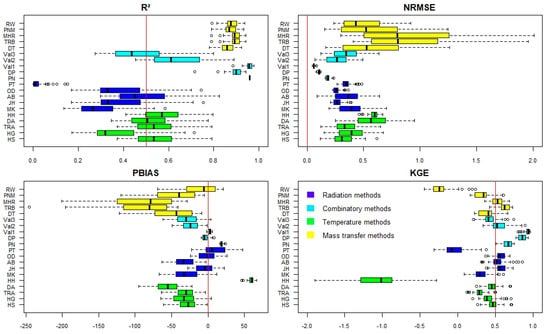 The alternative methods are classified into the following four categories (Table 2): aerodynamic, radiation-based, temperature-based, and combinatory methods. The choice of these methods is justified by their frequent use, the simplicity of their implementation, and their performance under different climate conditions.