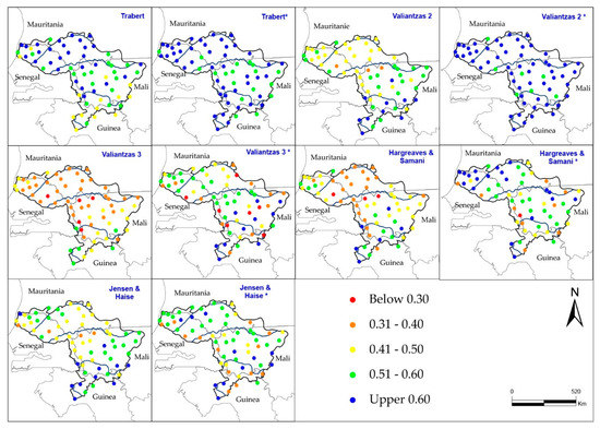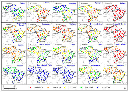 Figure 3 shows the spatial distribution of KGE values. It shows that the combinatory models of Val 1, DP, and PN are robust in all Senegal River basin climate zones. They have KGE values that vary from 0.51 to 0.97 over the entire basin. The performance of these methods is explained by the fact that they integrate the same climate variables as those of FAO56-PM. Among the methods integrating fewer climate variables, Trabert, Val 2, Val 3, HS, and JH are most robust (Figure 2 and Figure 3). The performance of these methods varies depending on the climate zones of the basin. Indeed, Trabert’s aerodynamic method is more accurate in the Sudanian and Sahelian zones with KGE values varying from 0.69 to 0.73. Similar results were obtained by Djaman et al. [29] in the Senegal River Valley. The performance of aerodynamic methods was also noted by [3] in Iran, Singh and Xu [60] in northwestern Ontario (Canada), and Djaman et al. [61] in Tanzania and Kenya. However, Ndiaye et al. [62] have shown that aerodynamic methods perform poorly in Burkina Faso. This difference could be explained by the constant values of these methods that do not adapt to all climate conditions. The performance of aerodynamic methods is explained by the fact that wind speed and temperature play an important role in evapotranspiration in arid and semi-arid environments [63].