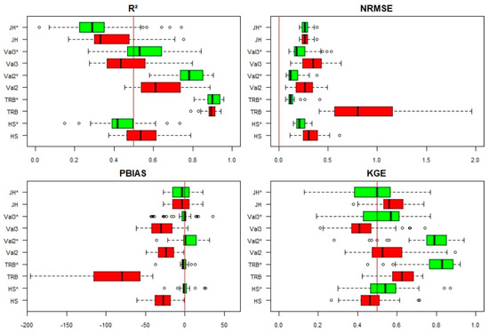 The calibration/validation improved the performance of the TRB, Val 2, Val 3, and HS methods. In fact, it increased the KGE of Trabert’s method by 32% and reduced estimation errors by 97%. However, a deterioration in the performance of the JH method is noted after calibration which is different from Irmak et al. [63], who reported that calibration of the JH method gives better results in humid climates. This deterioration could be explained by the poor performance of this method in semi-arid climates