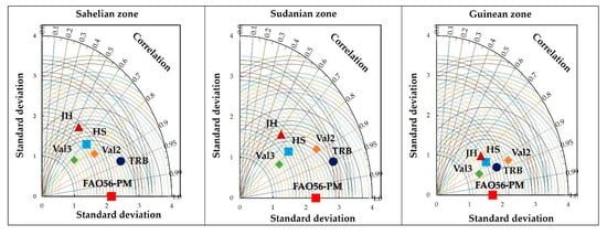 Data for the period 2006–2017 are used for the validation of the calibrated methods. Figure 6 gives the Taylor diagram which compares the results of the five validated methods and the FAO56-PM one as a function of climate zones, and Figure 7 gives the distribution of PBIAS. Results show that the methods of TRB and Val 2 always give the best estimates of ET0. They have the same amplitude of variation as the FAO56-PM method with high correlation coefficients between 0.93 and 0.95. The spatial distribution of the percentages of bias allows us to note that the Trabert method globally underestimates evapotranspiration from 1.1 to 37%. The most significant underestimates are noted in the Guinean zone where the Trabert method is less efficient. The Val 2 method overestimates the ET0 by 0.3%–31%, and the Val 3 methods, HS, and JH underestimate the reference evapotranspiration. These results are corroborated by those of Djaman et al. [29], who showed that the Trabert method underestimates the ET0 by 25% at the Ndiaye station in the Senegal river delta and by 6% at the Fanaye station in the Senegal river valley. In another study, Djaman et al. [45] showed that the Val 2 method underestimates the ET0 by-.13 mm in the Senegal delta. Ndiaye et al. [62] also showed that Trabert’s method underestimates ET0 in Burkina Faso.