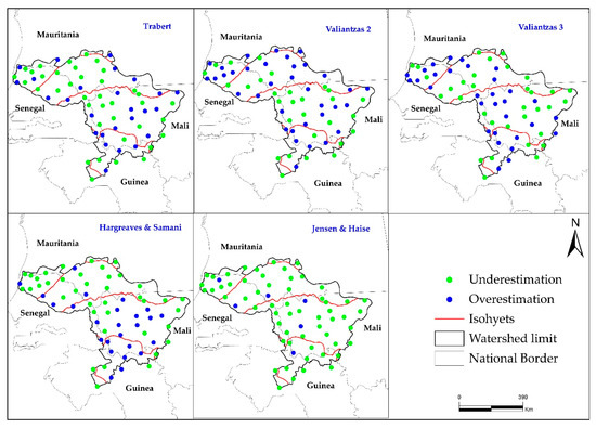 In the Guinean zone, the combinatory (Val 2, Val 3) and temperature-based (HS) methods give the best results for estimating ET0. Indeed, the values of KGE (Figure 2 and Figure 3) of Val 2 vary from 0.82 to 0.90, those of Val 3 from 0.53 to 0.74, and the KGE of the HS model vary from 0.53 to 0.74. Errors in estimating ET0 by these methods are also small in the Guinean area. These results are similar with those of Tabari [28] who showed the robustness of radiation and temperature-based methods in a humid climate in Iran. The performance of combinatory and temperature-based methods in the Guinean area of the basin is explained by the fact that they integrate solar radiation and temperature which have more impact on ET0 in humid climates [64,65]. According to these authors, in humid regions, the air is close to saturation and evapotranspiration is strongly influenced by the available energy (temperature and radiation).