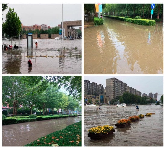 At present, the drainage of rainwater in this area mainly depends on the rainwater pipe network, all the pipe networks are laid along the main road and finally enter the urban main pipe through the drainage outlet located at the northwest corner of the campus. The study area belongs to a temperate monsoon climate with an average annual rainfall of 542.15 mm. The rainfall in June–September accounts for more than 60% of the annual rainfall. Therefore, the risk of urban waterlogging in the region increases sharply every summer. In addition, with the expansion of the city, the area shows a clear urban rain island effect, and its rainfall is increasing, and the rainwater pipeline network has gradually failed to meet the requirements for timely removal of rainwater, which has led to frequent campus flooding, as shown in Figure 5. By collecting drainage network data, and analyzing the flood simulation results before and after the improvement of the subcatchment division method, the rationality of the method improvement was tested.