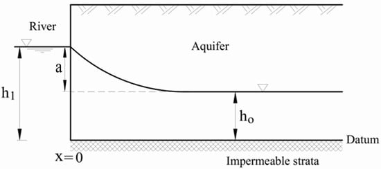 In this section, analytical solutions [,,] for the interaction between surface water and unconfined and confined aquifers are presented.