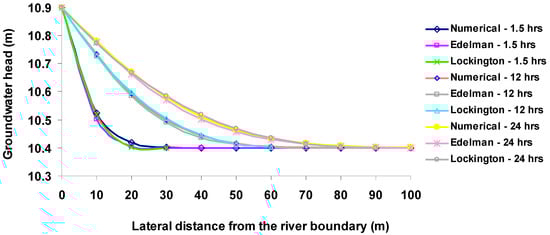 Figure 3 shows the numerical solution for one-dimensional transient flow through an unconfined aquifer and the analytical solutions of [,] for the heads at different lateral distances from the river at 1.5, 12, and 24 h The differences between the solutions of [,] and the numerical one are negligible; the maximum difference is 0.021 m between the Edelman [] and the numerical solutions, and the root mean squared error (RMSE) is 0.0075 m after 1.5 h. The maximum difference between the Lockington [] and the numerical solutions was 0.015 m, and the RMSE was 0.0048 m.