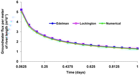 Figure 4 shows the match between the three solutions for the discharges at the river-aquifer boundary for a simulation period of 1 day. The maximum difference between the analytical (Edelman [] and Lockington []) and the numerical solutions for the groundwater flux per meter of river length is 0.17 m2 d−1, while the RMSE is 0.1 m2 d−1 at 1.5 h. The difference decreases with time.